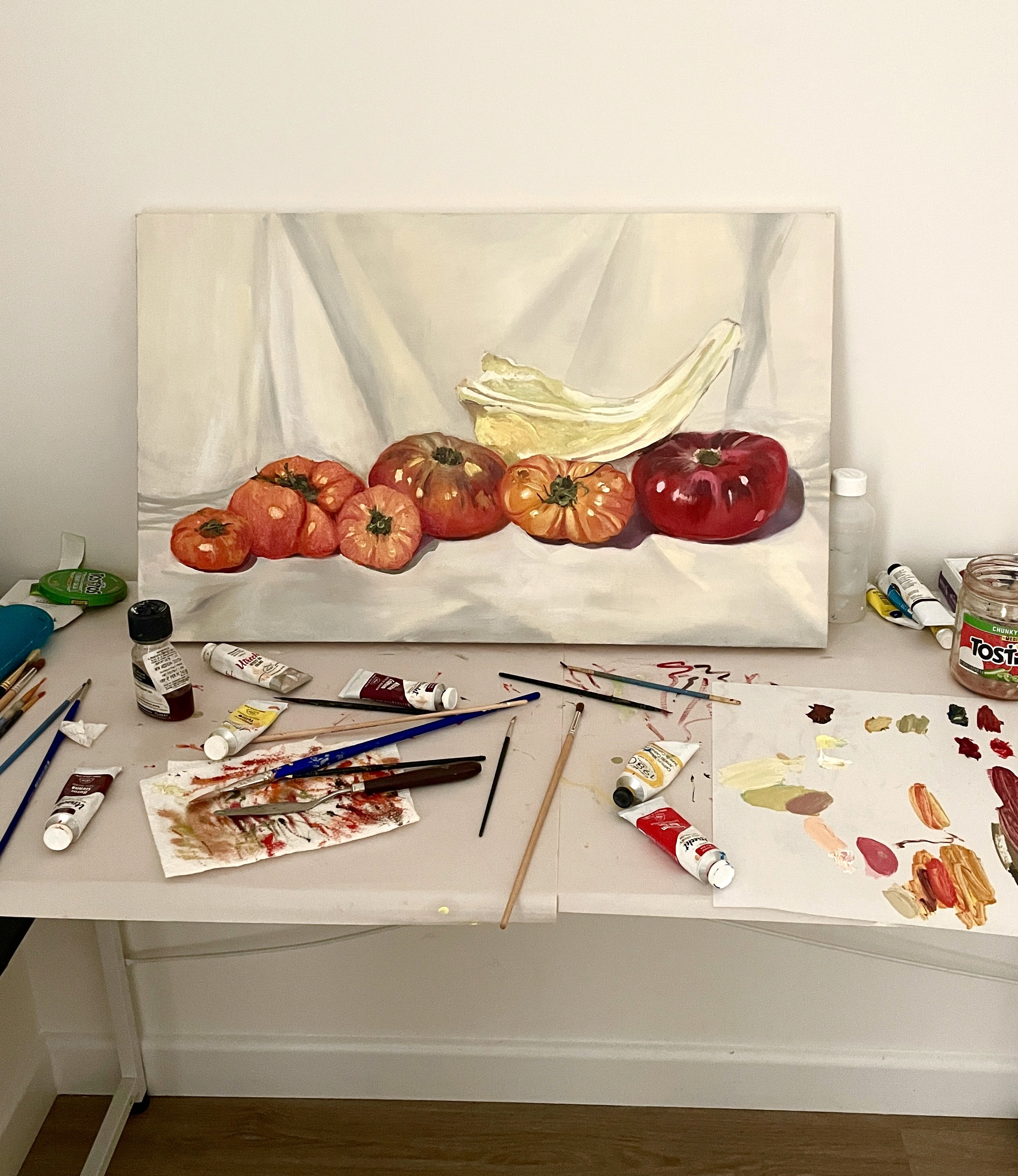 Oil paint, canvas stretching, still live, palette knife, acrylic paint, charcoal, ink.